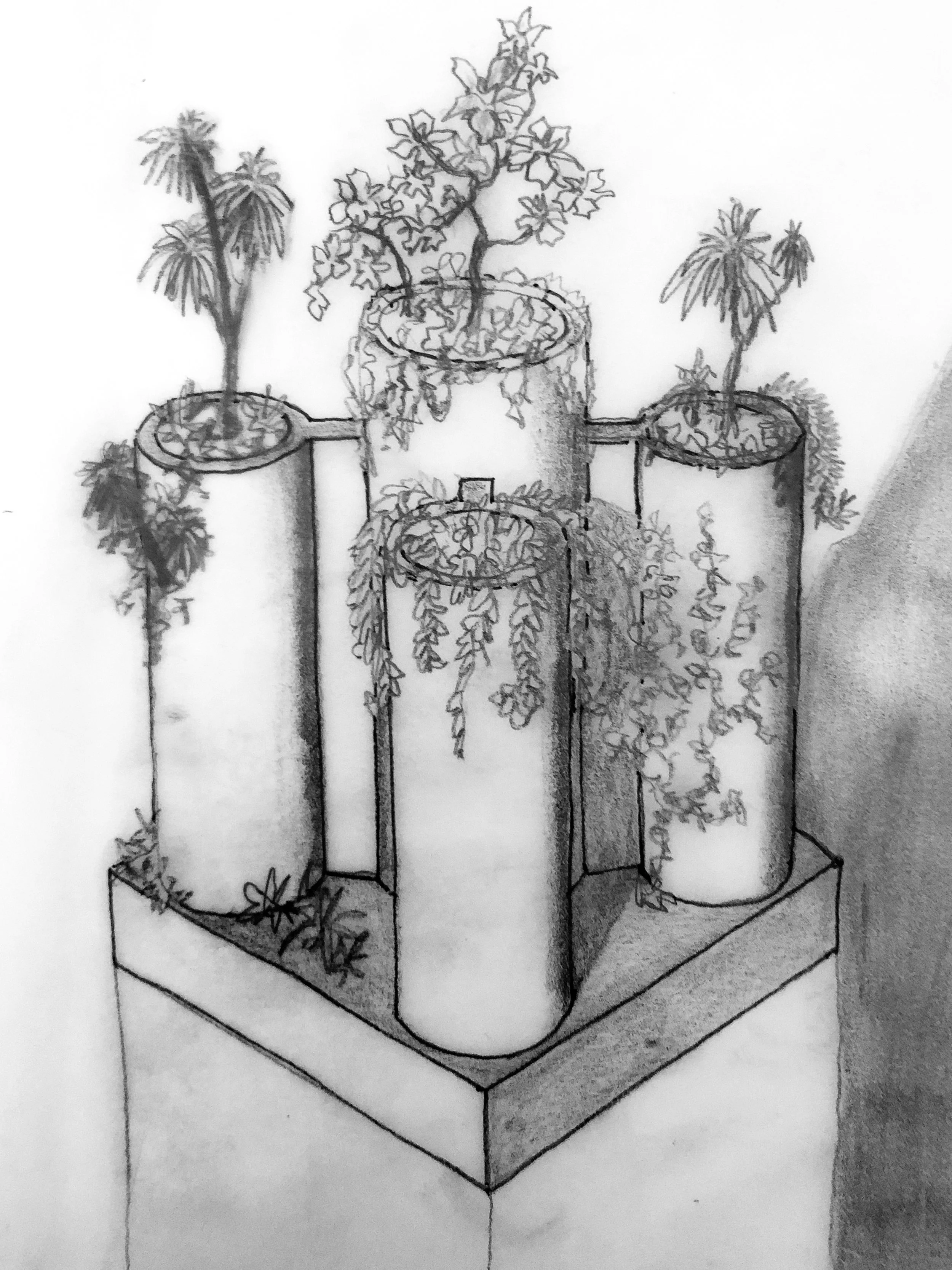 Sketch design for planted sculpture modelled on the Westin Bonaventure Hotel, Los Angeles
