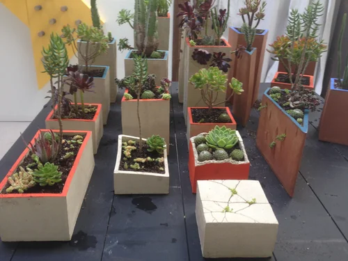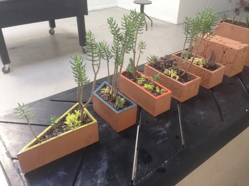 The array of planted vessels at different heights were my interpretation of this intersection of the grid and the topography of LA. These were planted with succulents designed to resemble the palm trees and giant succulents and cacti that populate the streets and gardens of this strange and wonderful city.