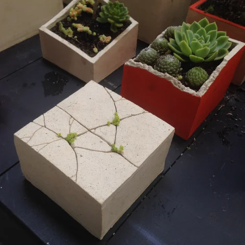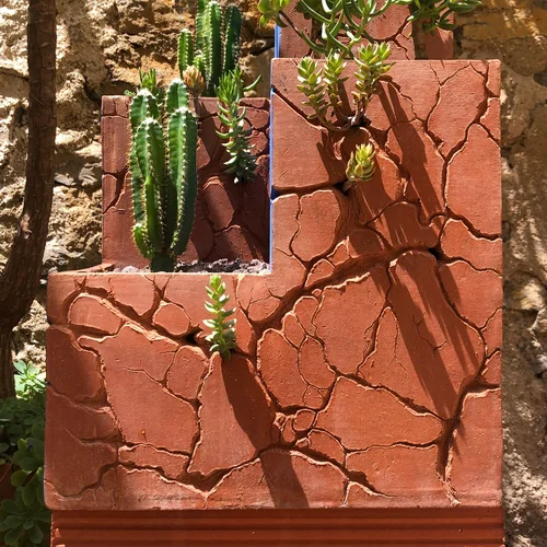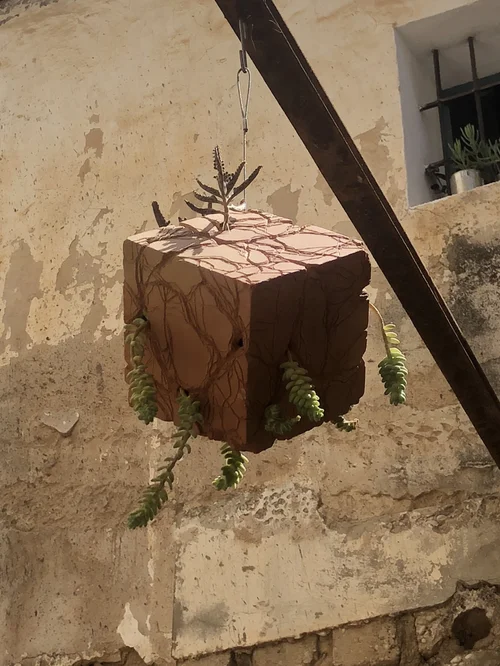 Between January and July 2018 I made a new series of ceramic vessels for plants after I relocated from Berlin to Altea, Spain. I set up a studio in the basement of a house awaiting renovation. Here I was able to revisit and develop the square sided planters carved with cracks, fissures and erosion channels taken from the landscape around me. I developed newer, more complex forms and types of planter: freestanding columns, tired forms, cubes and pyramids, as well as hanging planters in the form of cubes. The cracks I started gingerly in Los Angeles in 2017 grew and developed. As in LA, these always start with a real-world observation: cracks in concrete, road line paint, dried mud and sun-baked vinyl signs. Every material fractures differently and thus has its own story to tell.
