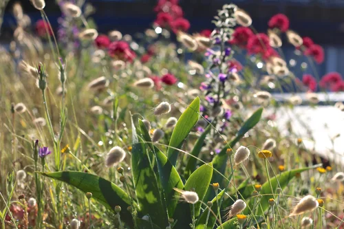 I planted the roof with a mix of herbaceous plants, grasses and succulents selected for their ability to tolerate sun and wind exposure and drought. I also planted several bulbs of species Crocus, Tulip and Muscari (Grape Hyacinth). Over time I’ve added more plants as seeds or cuttings found in gardens, on beaches, wastelands and other habitats with analogous conditions to this rooftop in central London. Some like the hare’s tail grass (Lagurus ovatus) with its furry flower and seed heads, have multiplied and thrived. This and the Viper’s Bugloss (Echium vulgare) were collected from sand dunes on the west coast of France. The roof is an ongoing experiment.