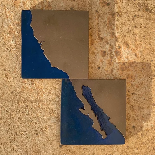 Two tiles 19 x 19 x 2cm in black Valencia earthenware with glaze, representing the coastline of California, Baja California and Baja California Sur.
